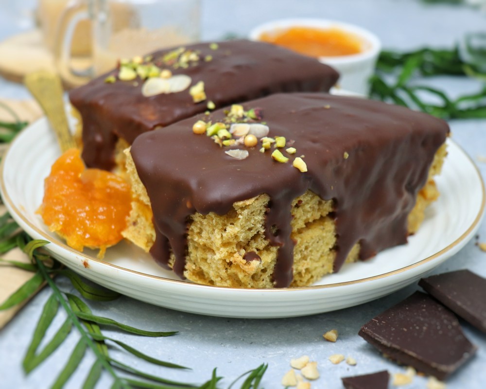 Una volta che il dolce si è raffreddato, tagliarlo a metà in altezza e spennellare abbondantemente i due strati. Farcire con la marmellata di albicocca e riassemblare il dolce. Tagliare in 4 parti in un senso e poi a metà nell’altro per ottenere 8 tortine.