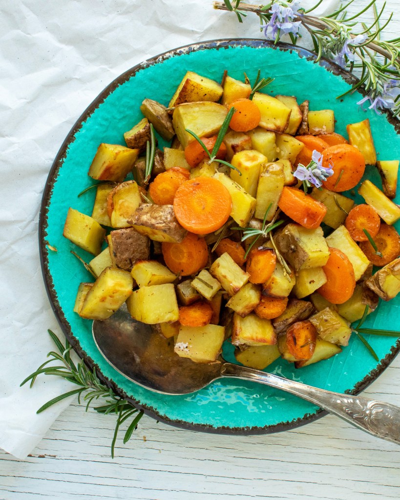 Disporre su una teglia e condire con sale, pepe, rosmarino e olio. Mescolare e infornare a 180°C per 20 minuti e poi alzare a 200°C per altri 10 minuti o fino a quando le patate sono ben dorate. Servire subito. Buon appetito!